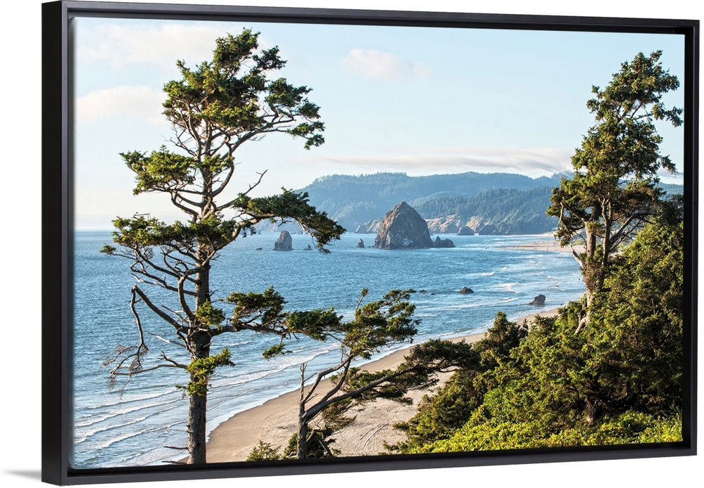 <p>Landscape photograph of Cannon Beach through trees with Haystack Rock in the distance.</p>