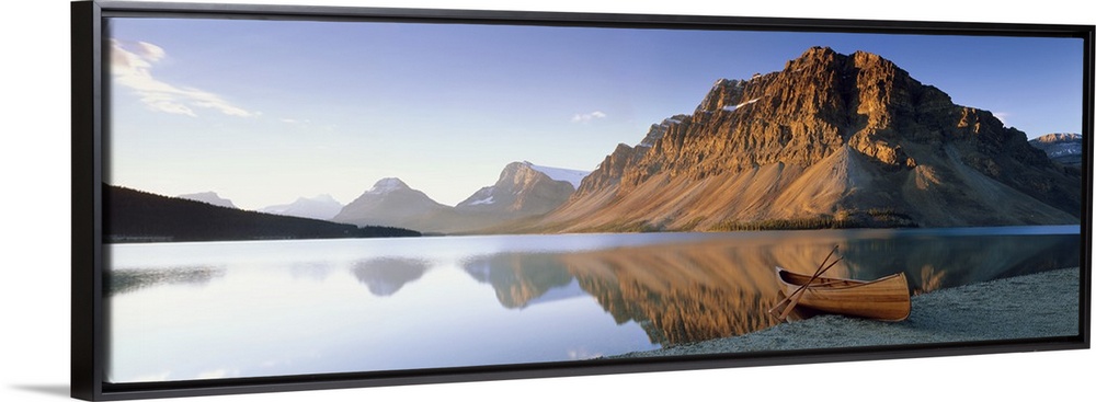 <p>Panoramic photo on canvas of a smooth lake with a wooden canoe on the shoreline and big rocky mountains in the distance.</p>