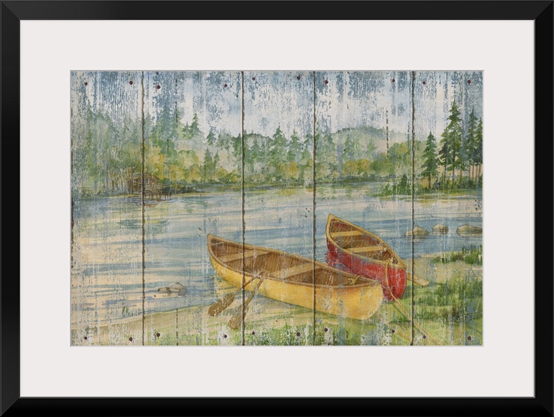 <p>Rustic-style painting of two canoes with oars on the edge of a shallow river, done on wood panels.</p>