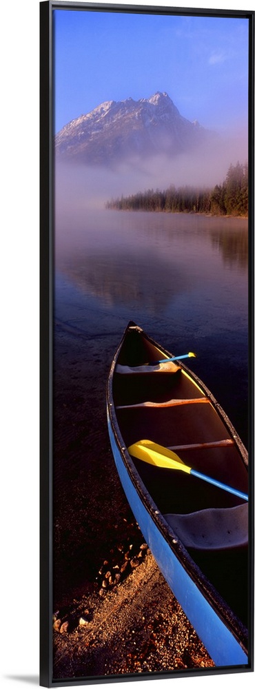 <p>Tall and narrow canvas photo of a canoe half way in a lake with fog in the distance in front of a mountain.</p>