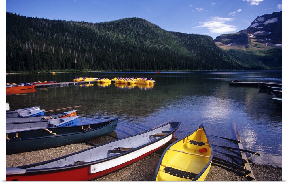<p>Canoes and pedal watercraft await tourists at Cameron lake in Waterton Lakes National Park in Alberta Canada</p>