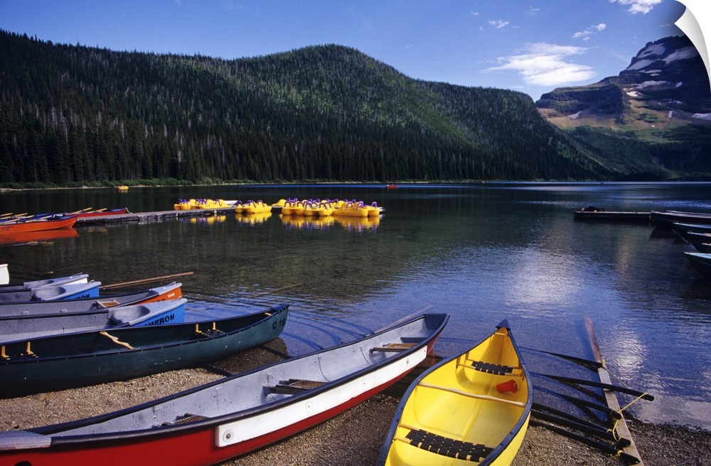 <p>Canoes and pedal watercraft await tourists at Cameron lake in Waterton Lakes National Park in Alberta Canada</p>