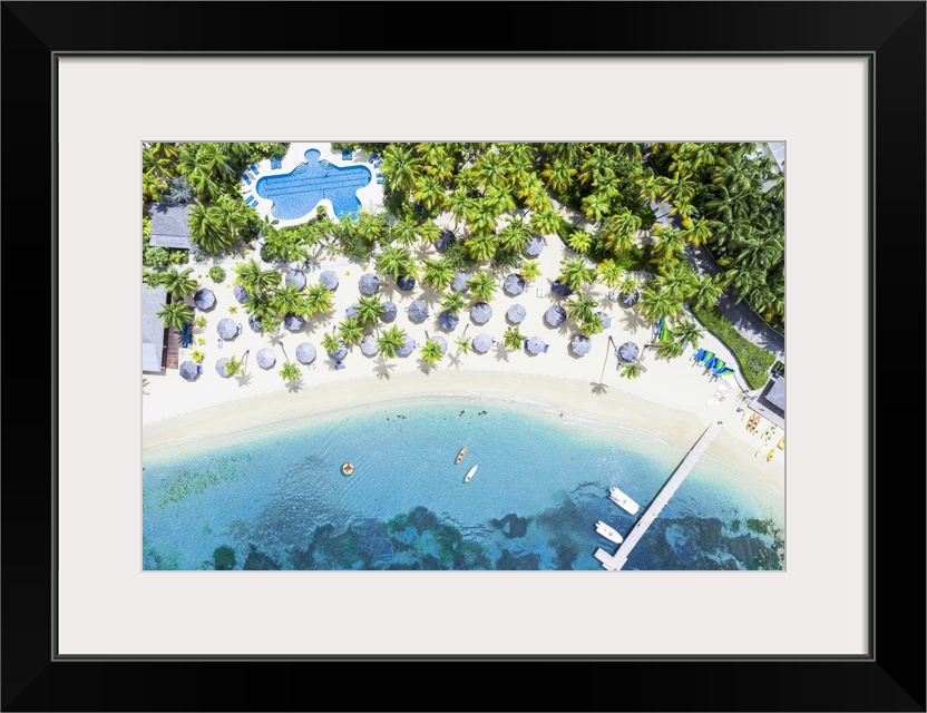 <p>Canoes floating in the tropical lagoon of luxury resort with swimming pool on palm fringed beach, Antigua, West Indies, Caribbean, Central America</p>