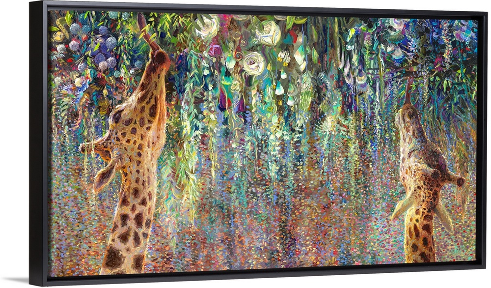 <p>Brightly colored contemporary artwork of two giraffes eating from hanging flowers.</p>