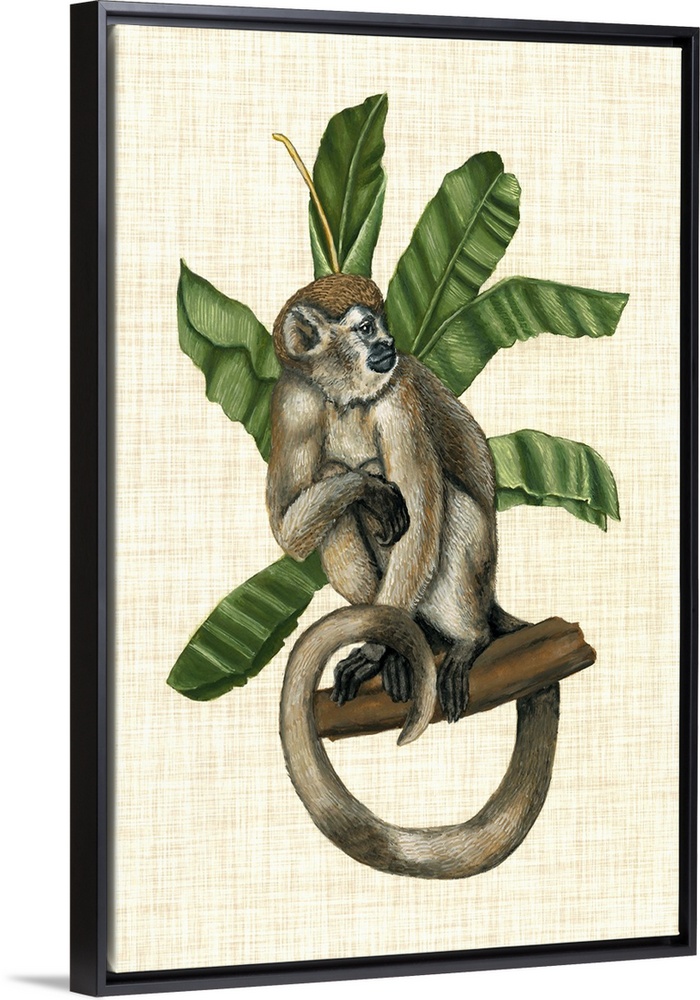 <p>Vintage stylized scientific wildlife illustration of a monkey with tropical leaves against a burlap background.</p>