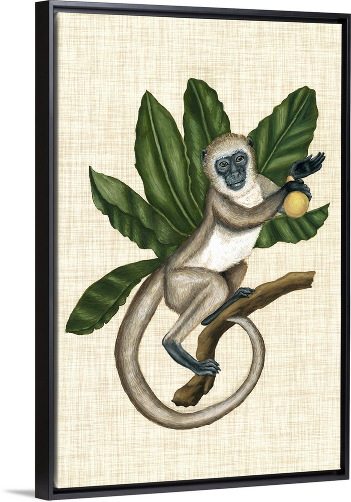 <p>Vintage stylized scientific wildlife illustration of a monkey with tropical leaves against a burlap background.</p>