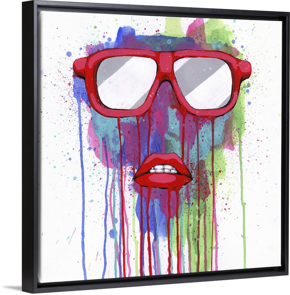 <p>Pop art painting of sunglasses and red lips with paint splatters and drips.</p>