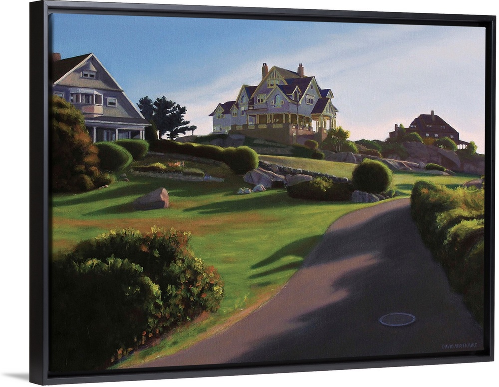 <p>Contemporary painting of a neighborhood with large houses at sunrise.</p>