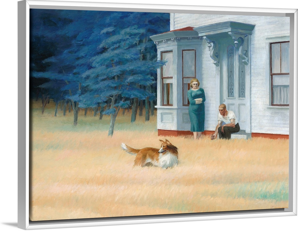 <p>Cape Cod Evening, by Edward Hopper, 1939, American painting, oil on canvas. Hopper described this painting as: 'In the woman I attempted to get the broad, strong-jawed face and blond hair of a Finnish type of which there are many on the Cape. The man is a</p>