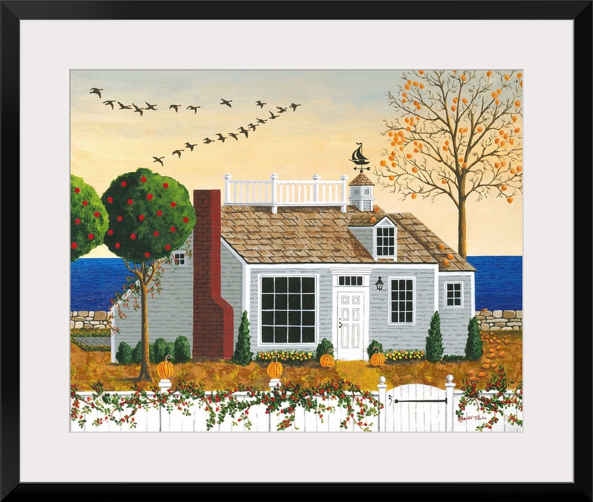 <p>A small house near the water in New England in autumn.</p>