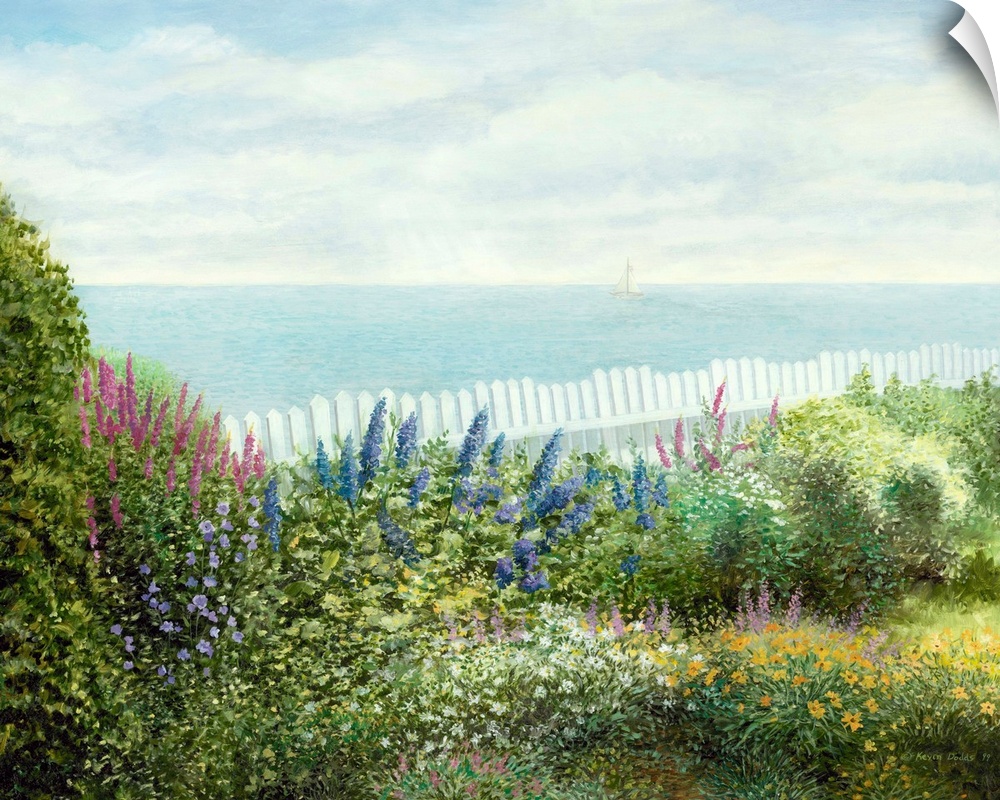 <p>Contemporary artwork of a garden in Cape Cod overlooking the ocean.</p>