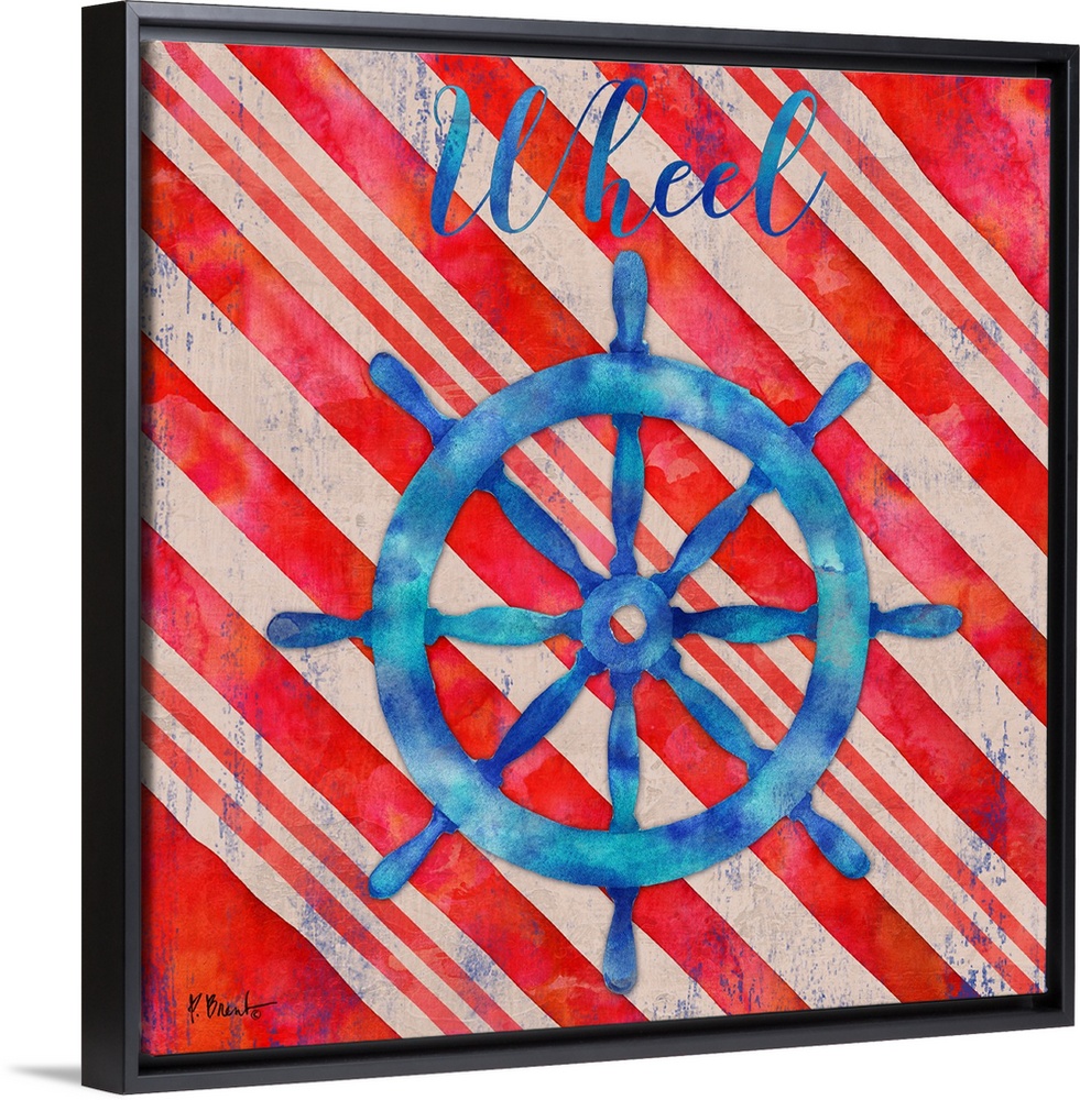 <p>Square nautical decor in red, white, and blue with an illustrated ship wheel in the center and "Wheel" written at the top.</p>