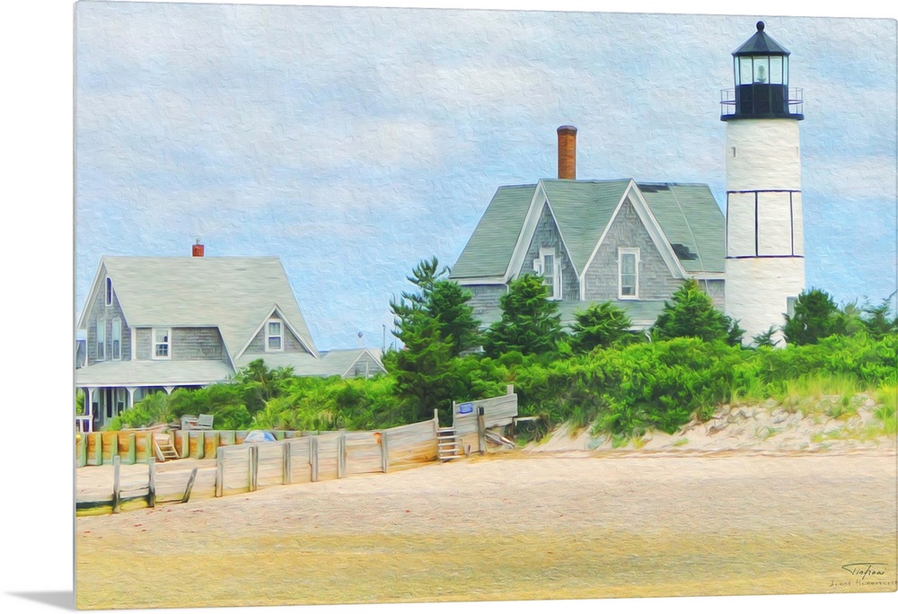 <p>A lighthouse on the edge of a sandy beach in New England.</p>