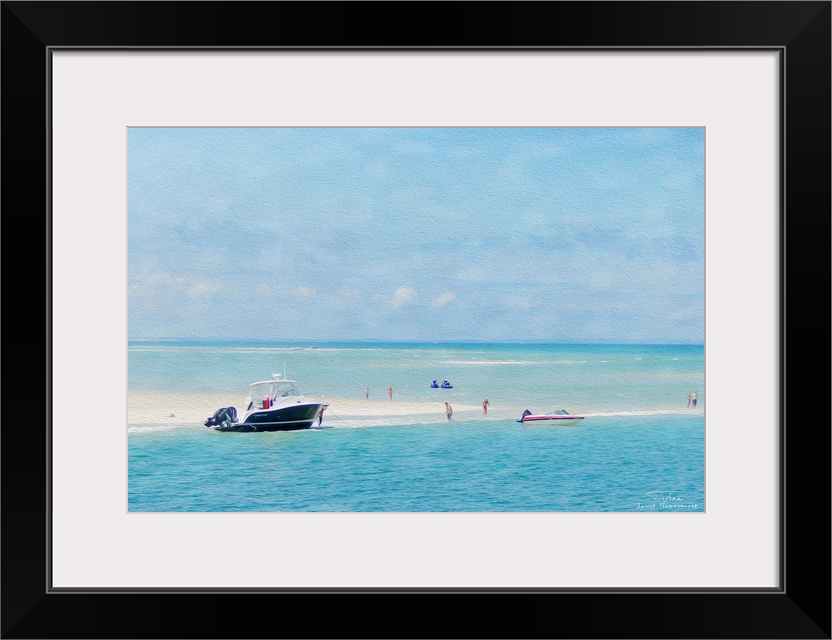<p>A boat at the edge of a sandy beach with jet skis on the water.</p>