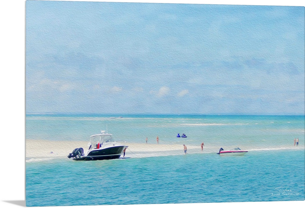 <p>A boat at the edge of a sandy beach with jet skis on the water.</p>