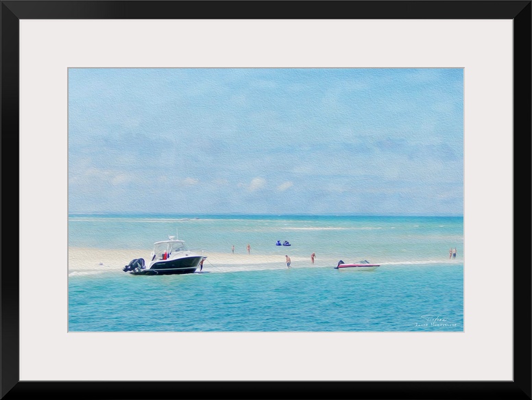 <p>A boat at the edge of a sandy beach with jet skis on the water.</p>