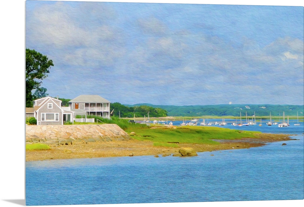 <p>A house on the sea shore with sailboats in the distance in New England.</p>