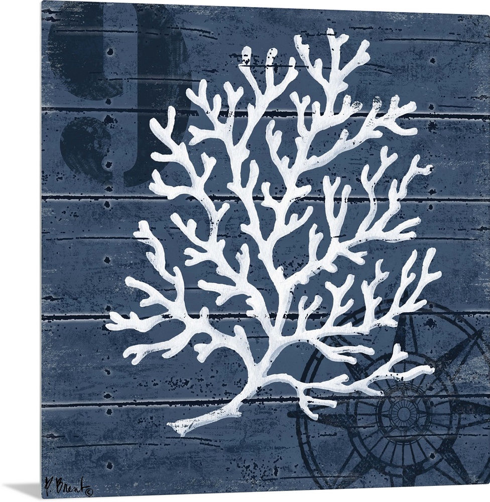 <p>Contemporary decorative artwork of a coral illustration on a dark, nautical background.</p>