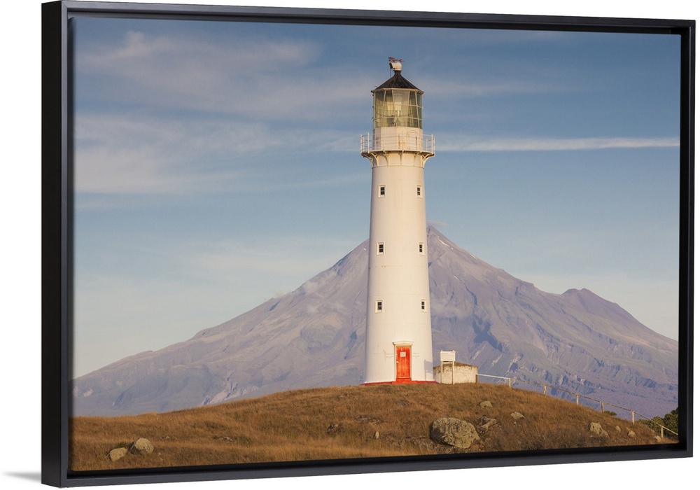 <p>New Zealand, North Island, New Plymouth-area, Pungarehu, Cape Egmont Lighthouse and Mt. Taranaki, dusk</p>