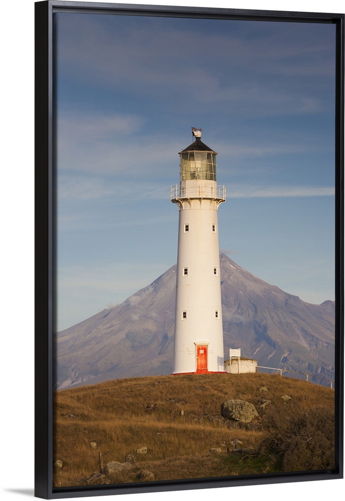 <p>New Zealand, North Island, New Plymouth-area, Pungarehu, Cape Egmont Lighthouse and Mt. Taranaki, dusk</p>