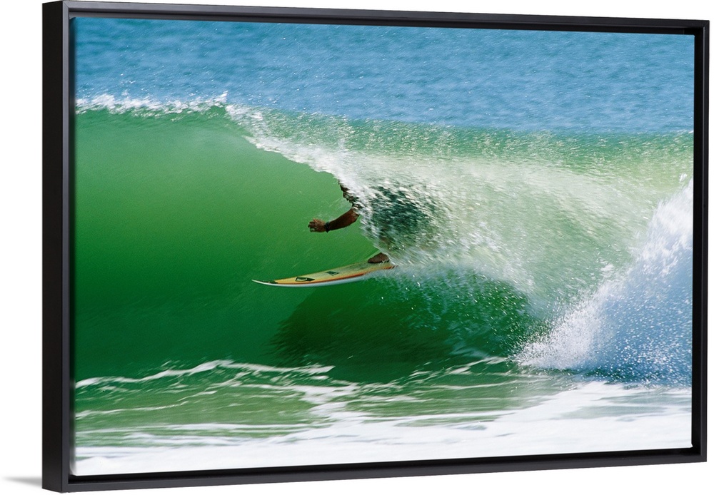 <p>From the National Geographic Collection a landscape photograph of a surfer passing through a barrel wave.</p>