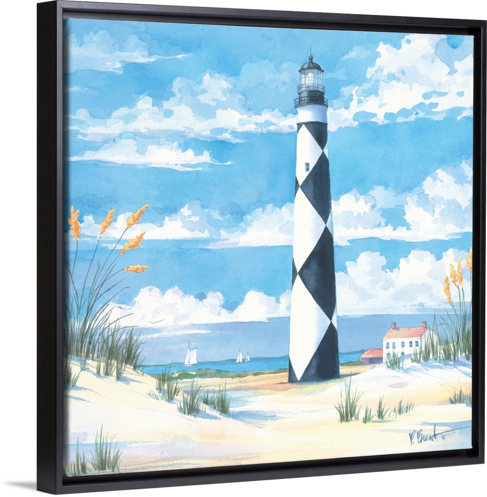 <p>Watercolor painting of a lighthouse painted with a diamond pattern on a sandy beach.</p>