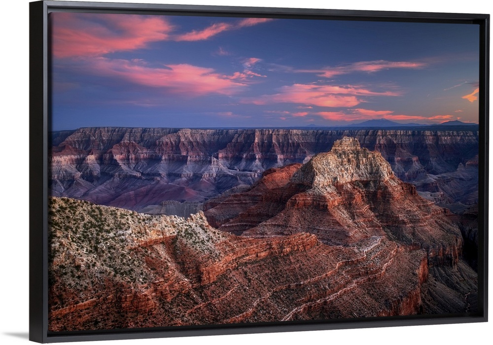 <p>Sunset at Cape Royal Point on the Grand Canyon's North Rim can be stunningly beautiful, with clouds painted pastel colors. The mountains in the distance are the San Francisco Peaks near Flagstaff, Arizona.</p>