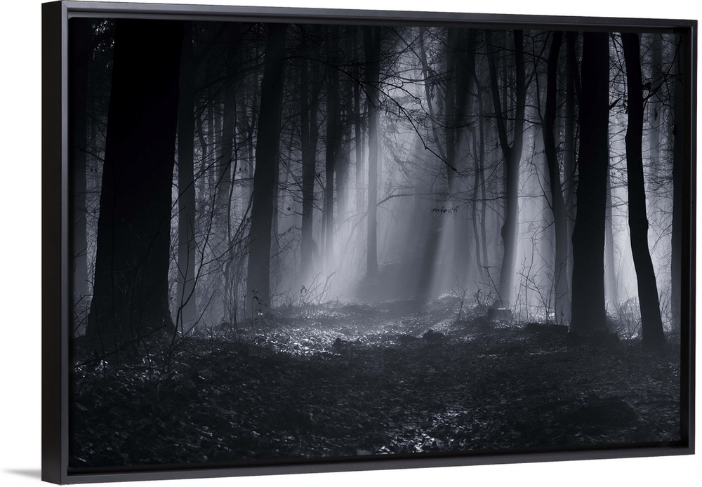 <p>A foggy forest landscape shrouded in darkness.</p>