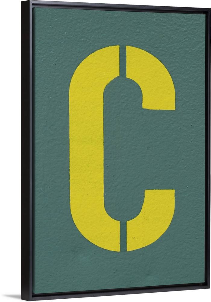 <p>Yellow letter C sprayed on a greyish, green wall.</p>