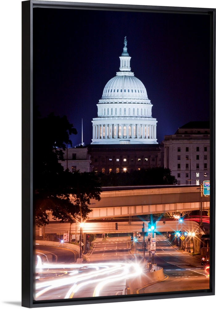 <p>USA, District of Columbia, Washington, DC, Capitol Building looms above traffic along New York Avenue on summer evening</p>