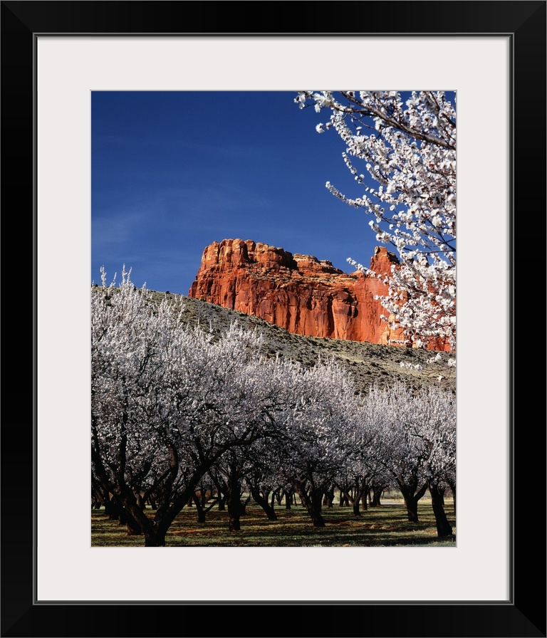<p>Landscape photograph of orchard trees with white blossoms and a rock formation from Capitol Reef National Park in the background.</p>