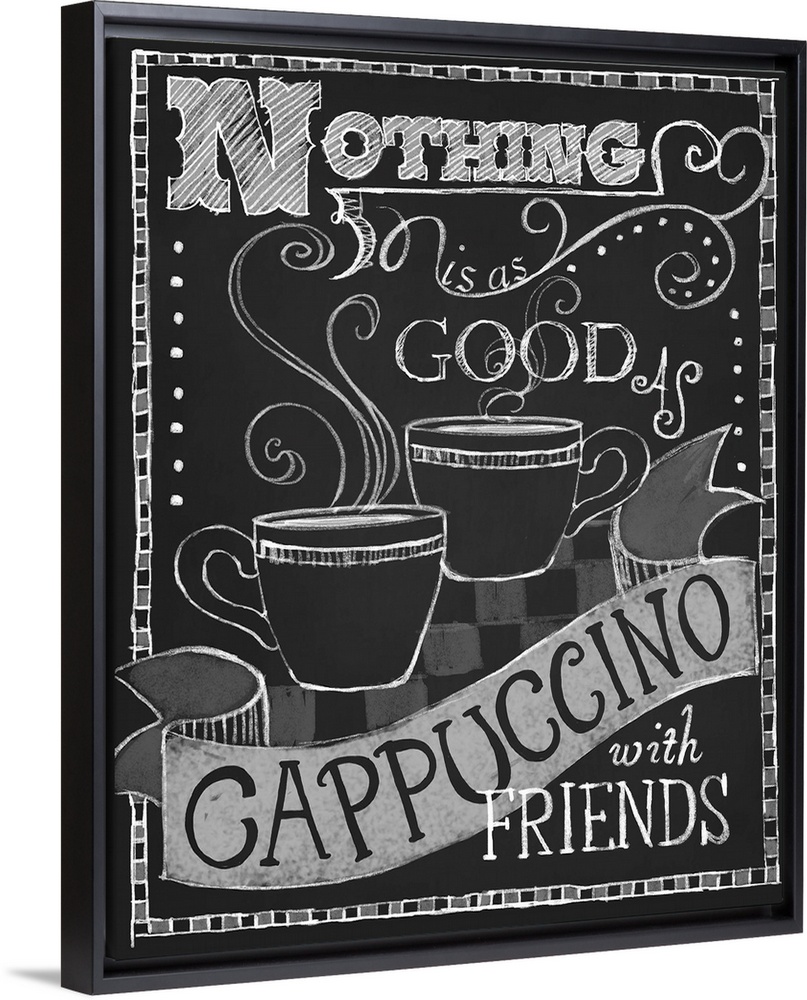 <p>Chalkboard-style sign with a cup of coffee that reads "Nothing is as good as cappuccino and friends."</p>