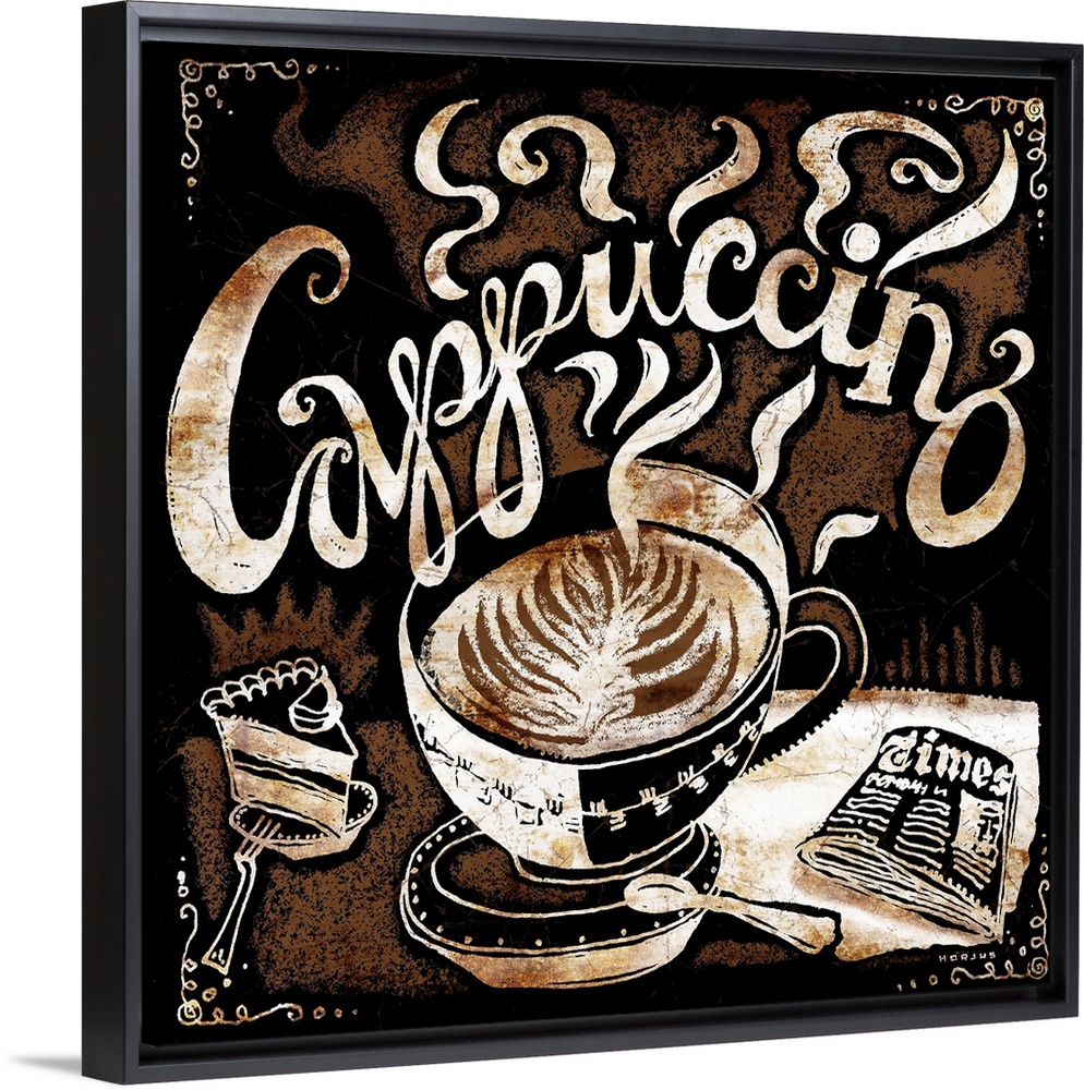 <p>A perfectly poured cappuccino with a side of cake and a newspaper, with the word cappuccino illustrated in cursive script at the top.</p>