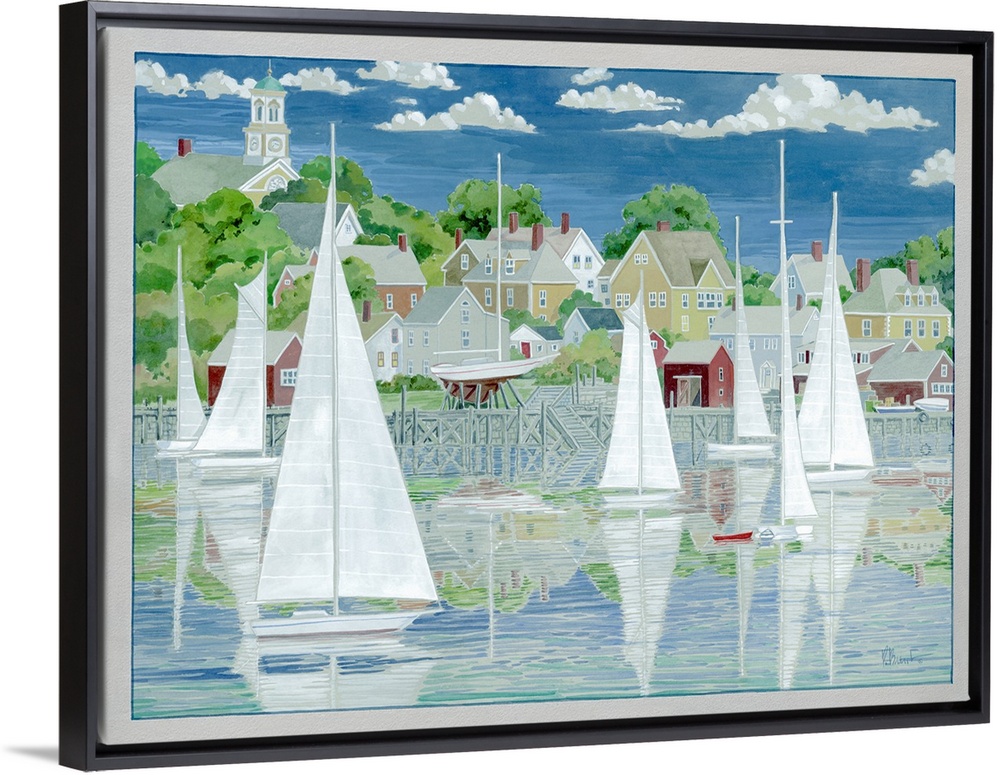 <p>Contemporary painting of several sailboats reflected on the water by coastal houses.</p>