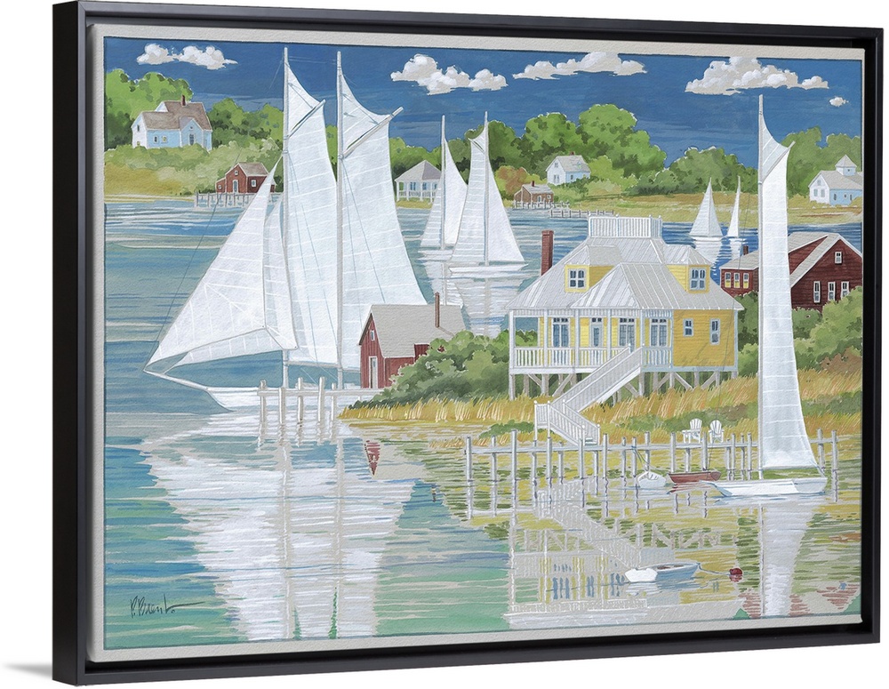 <p>Contemporary painting of several sailboats reflected on the water by coastal houses.</p>