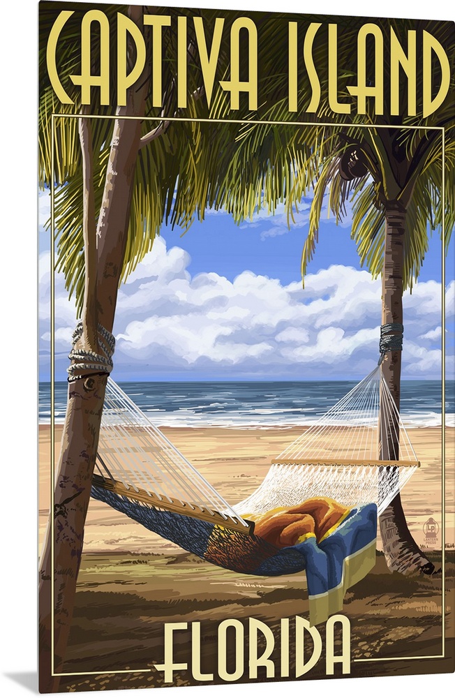 <p>Retro stylized art poster of a hammock tied up between two palm trees on a beach.</p>