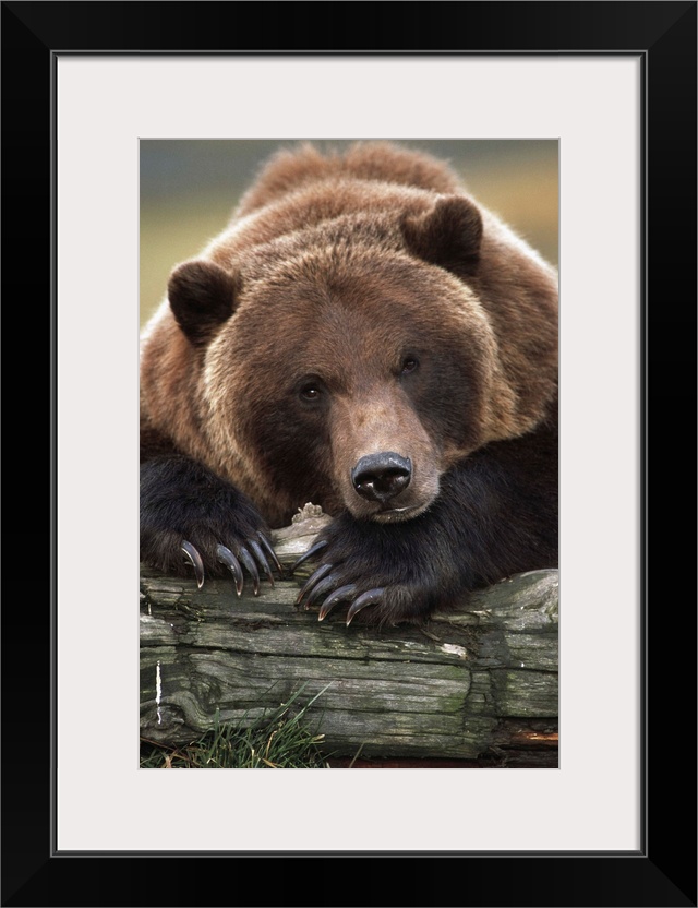 <p>Captive Brown Bear Rests With It Front Legs Outstretched On A Log At The Alaska Wildlife Conservation Center, Alaska Captive</p>