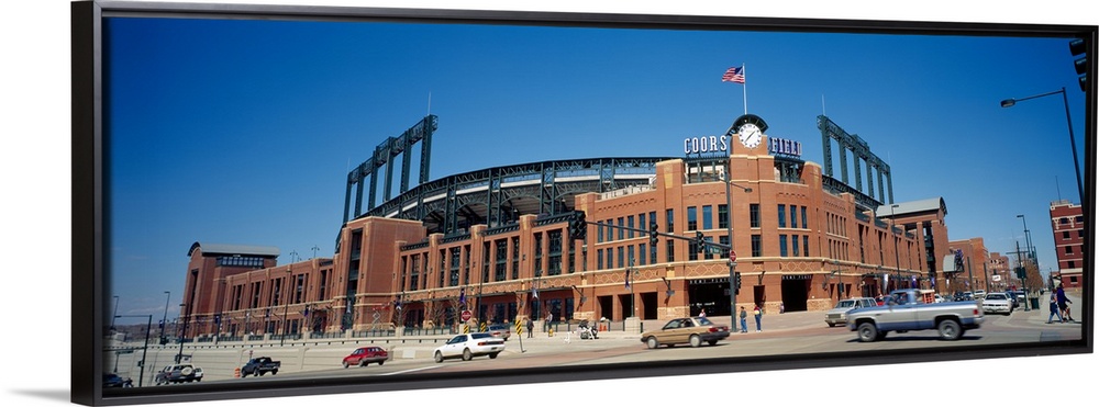 <p>Car moving on the road in front of a baseball stadium, Coors Field, Denver, Colorado, USA 1995</p>