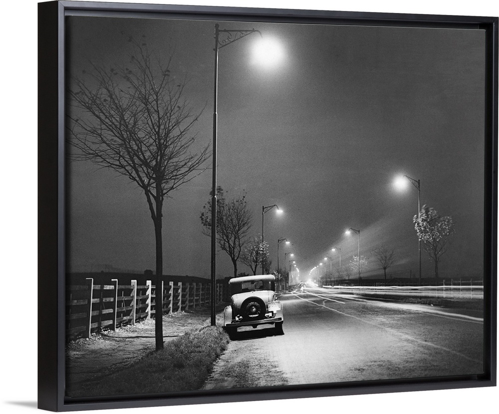 <p>A car parked on a road illuminated by street lights.</p>