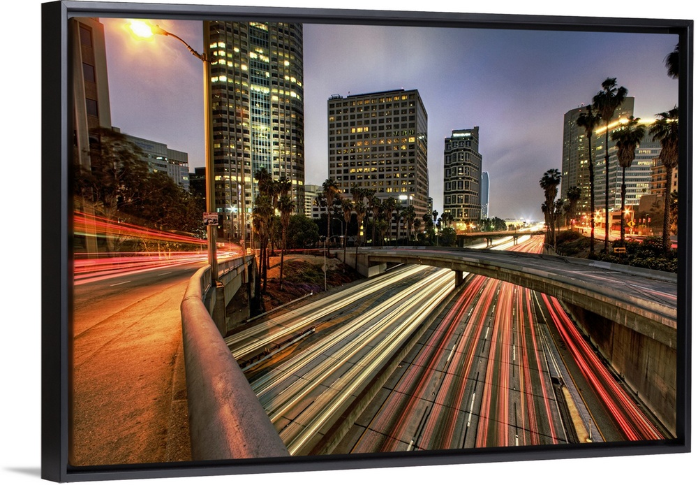 <p>A large photograph of some of downtown Los Angeles with the lights of cars streaking through.</p>