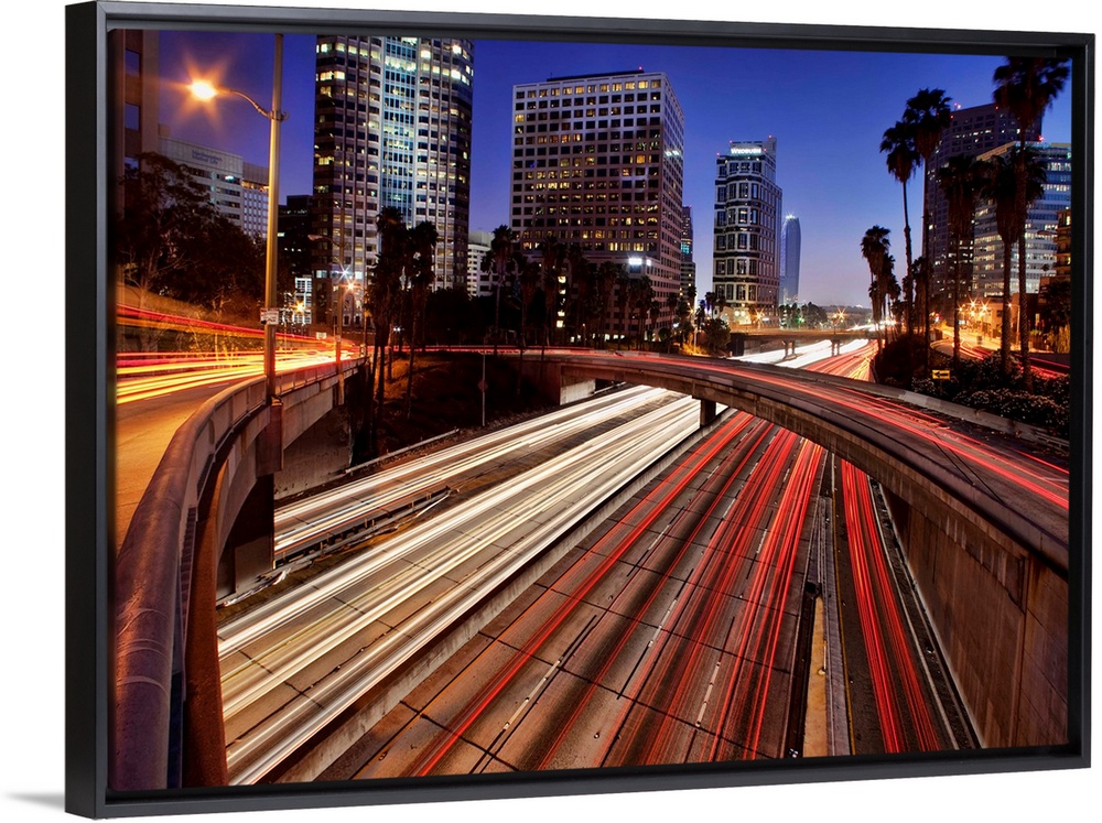 <p>Car trails at dusk in downtown Los Angeles, California</p>
