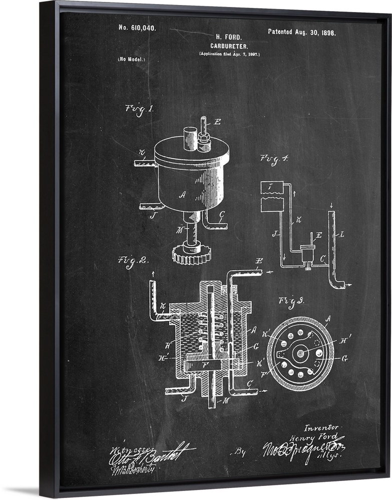 <p>Black and white diagram showing the parts of Henry Ford's carburetor.</p>
