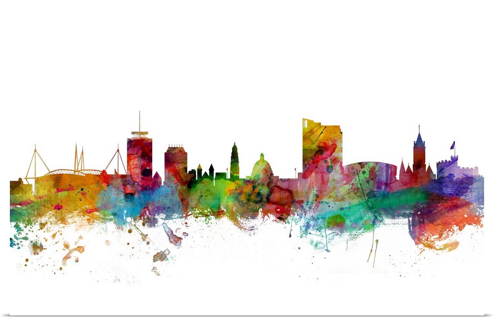 <p>Contemporary piece of artwork of the Cardiff, Wales skyline made of colorful paint splashes.</p>