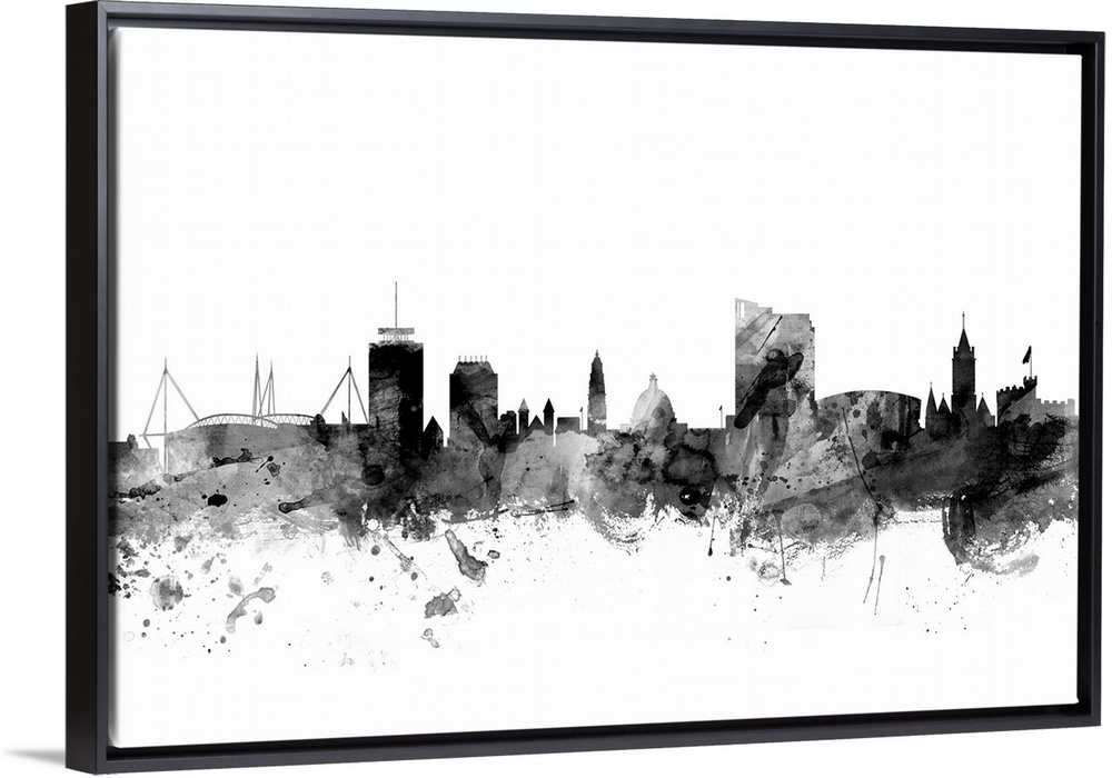 <p>Contemporary artwork of the Cardiff city skyline in black watercolor paint splashes.</p>