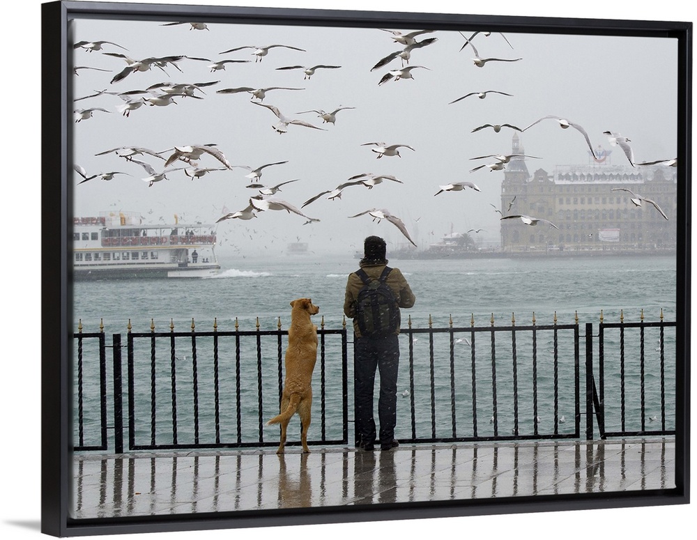 <p>A person and a dog look out at a flock of seagulls over the sea, Istanbul, Turkey.</p>