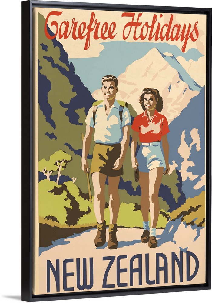 <p>Carefree holidays New Zealand. 1930's travel poster shows a young man and woman hiking in the mountains.</p>