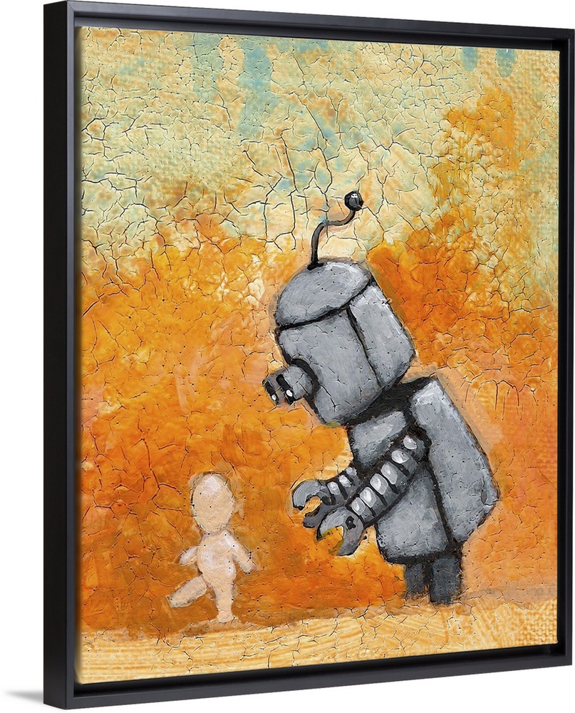 <p>Illustration of a small grey robot watching over an even smaller figure.</p>