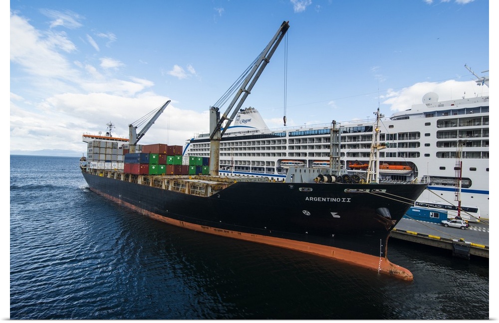 <p>Cargo ship anchoring in the harbour of Ushuaia, Tierra del Fuego, Argentina, South America</p>