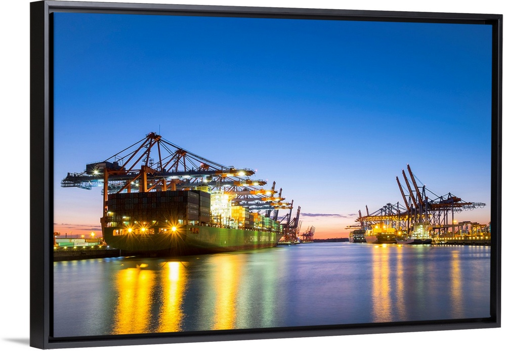 <p>Cargo ships being loaded at Eurokai and Burchardkai in Hamburg Harbor at night, Waltershofer Hafen, Hamburg, Germany.</p>