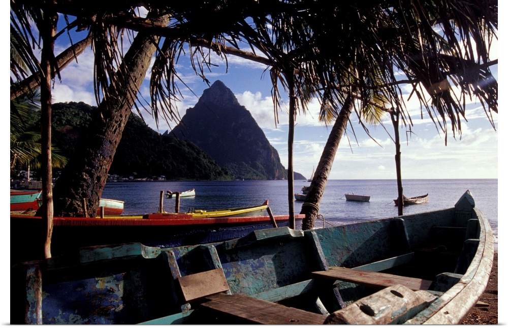 <p>Caribbean, BWI, St. Lucia, Fishing boats and Pitons, Soufriere.</p>